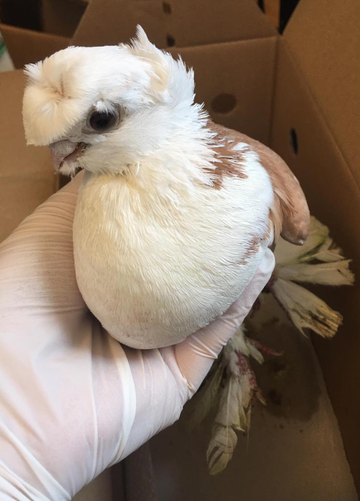 Mit 208g ist sie eine eher zierliche Zuchttaube. Sie ist sehr ruhig und macht bei der Medikamentengabe, die wegen des kurzen Schnabels wirklich nicht einfach ist, zum Glück sehr gut mit.
