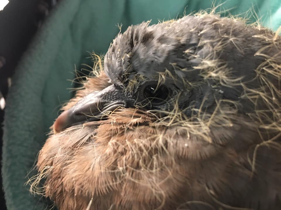Hier seht ihr unser neues Pflegekind. Ein schon relativ großes Ringeltaubenküken, das vermutlich der Sturm es aus dem Nest gepustet hat. Um die Fundstelle herum waren leider weder Eltern noch ein Nest zu finden. So wird es nun erstmal bei uns aufgepäppelt, denn es ist sehr dünn und hatte anfangs starken Durchfall.