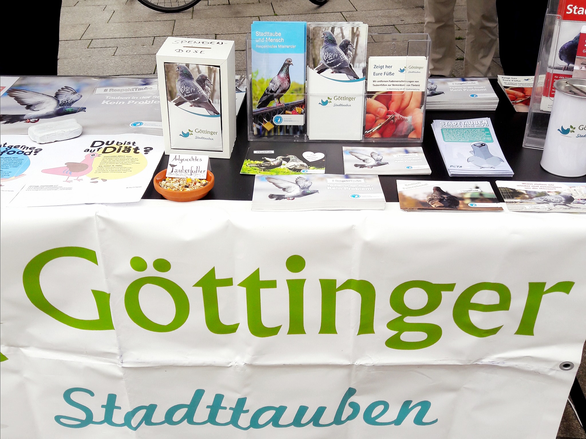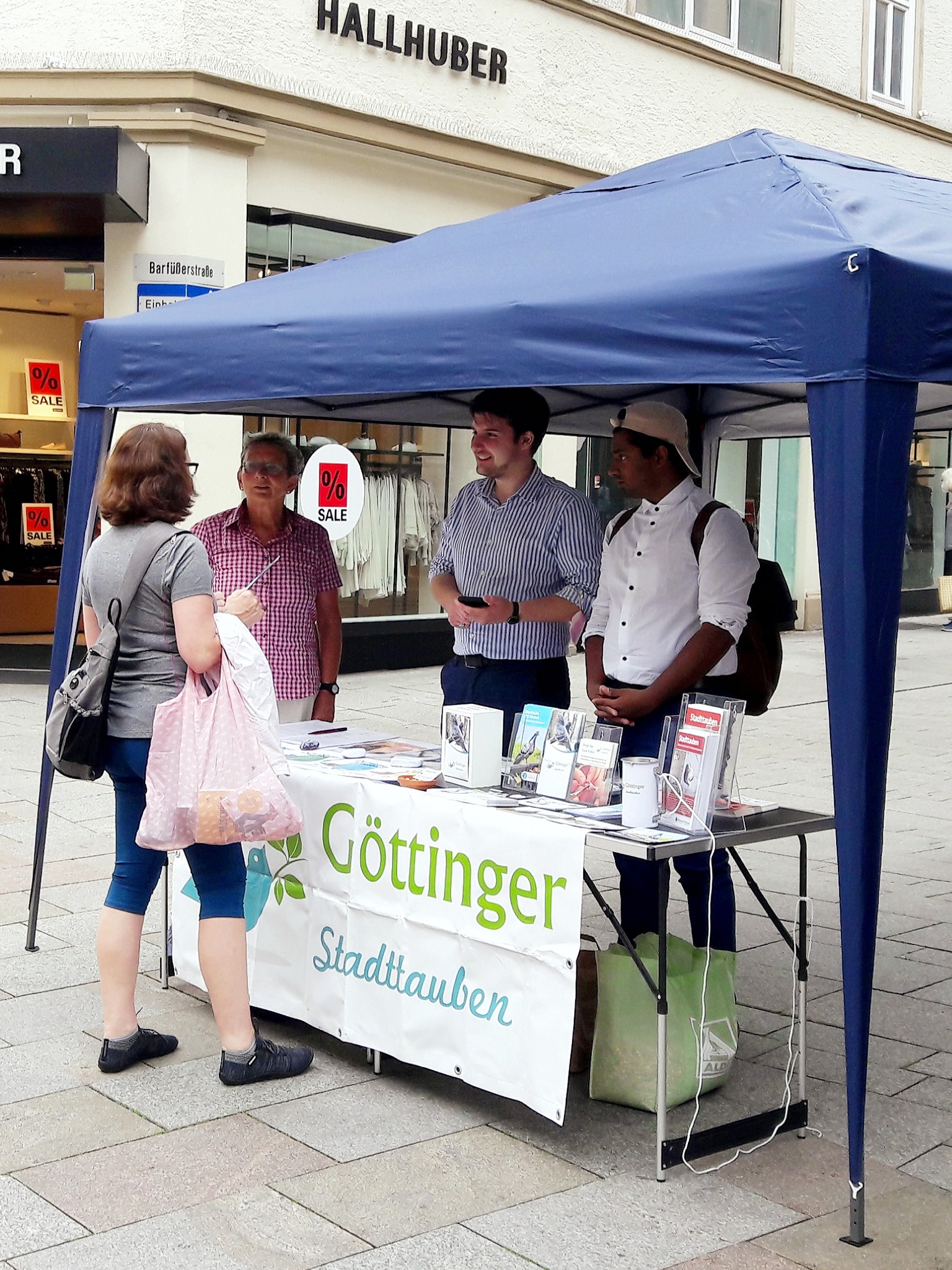 Aufklärungsaktion beim Göttinger Markt: Bei schönem Sommerwetter waren wir heute nach mehreren Monaten pandemiebedingter Pause endlich mal wieder in der Göttinger Innenstadt mit einem Aktionsstand unterwegs, um interessierte Passant*innen über die Situation der Stadttauben sowie das Leid der Brief- und Hochzeitstauben aufzuklären und über unsere Vereins- und Pflegearbeit zu informieren.