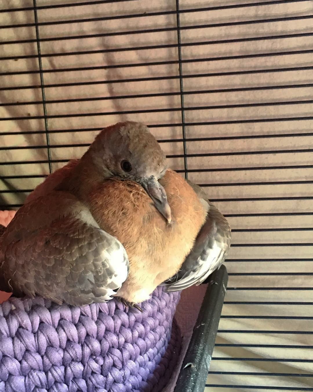 Als sie zu Hause angekommen war, nahm sie Kontakt zu einer unserer Pflegestellen auf, wo die kleine Taube schließlich total fertig und mit extremem Hungerkot ankam. Sie muss schon länger nicht mehr von den Eltern gefüttert worden sein.