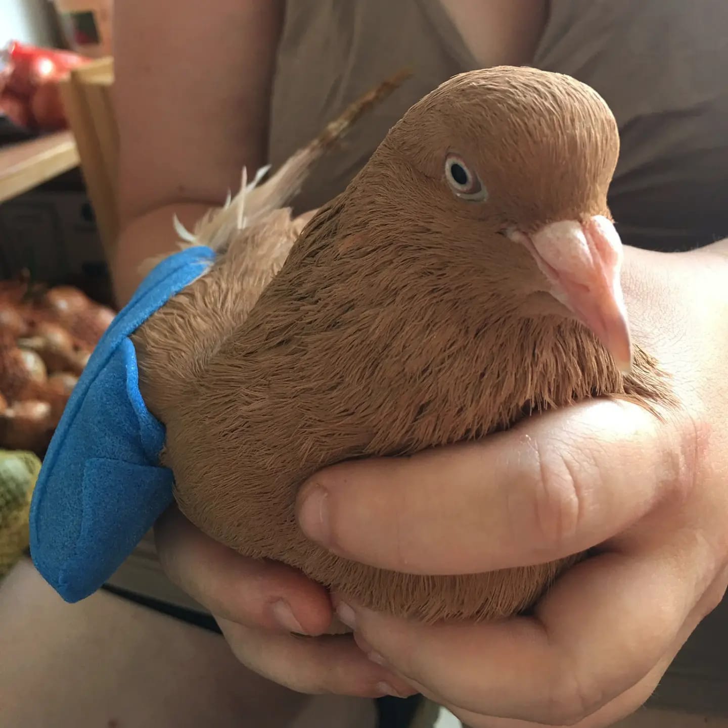 Er hatte eine Unterarmfraktur, die von uns verbunden wurde. Den Verband hat er sich gleich erstmal selbst entfernt. Leider muss er ihn aber noch ein bisschen tragen, weil ein Bruch bei Tauben etwa 14 Tage braucht, um zu verheilen.