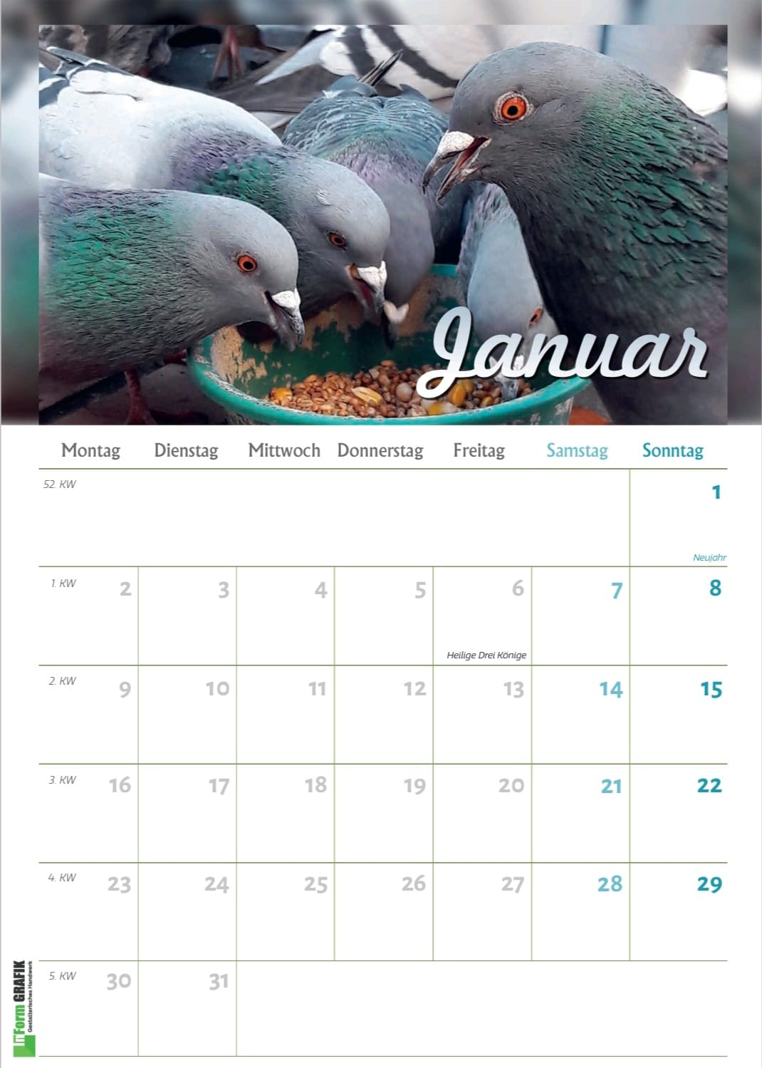 Wir finden auch das fünfte Jahr in Folge, es ist wieder ein richtig schöner, professionell gestalteter Kalender mit Fotoaufnahmen einiger unserer Pflegetauben und Tauben aus unserem betreuten Taubenschlag in Göttingen sowie Motiven von Stadttauben in der Göttinger und Hann. Mündener Innenstadt geworden. Der Kalender entstand erneut in Kooperation mit InForm GRAFIK (www.informgrafik.de). Eine kleine Vorschau der Bildblätter haben wir hier für euch.