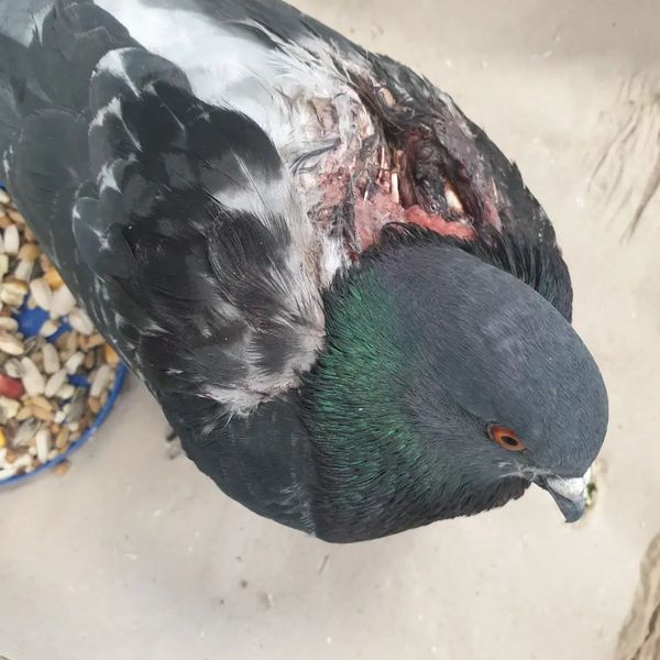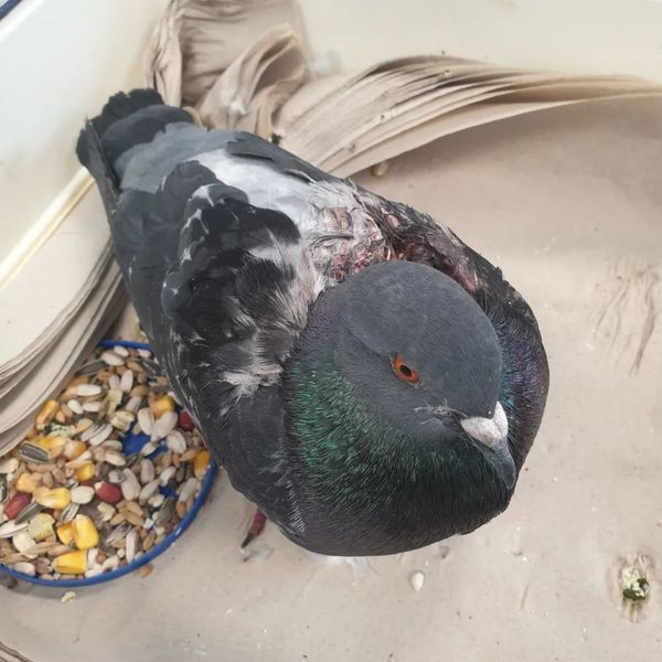 Am Abend wurde uns eine Taube mit blutverschmiertem Rücken gemeldet. Als wir zum Sichern ankamen, konnte man sie einfach hochnehmen. Sie machte keine Anstalten zu fliehen.