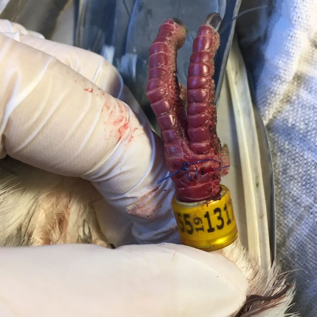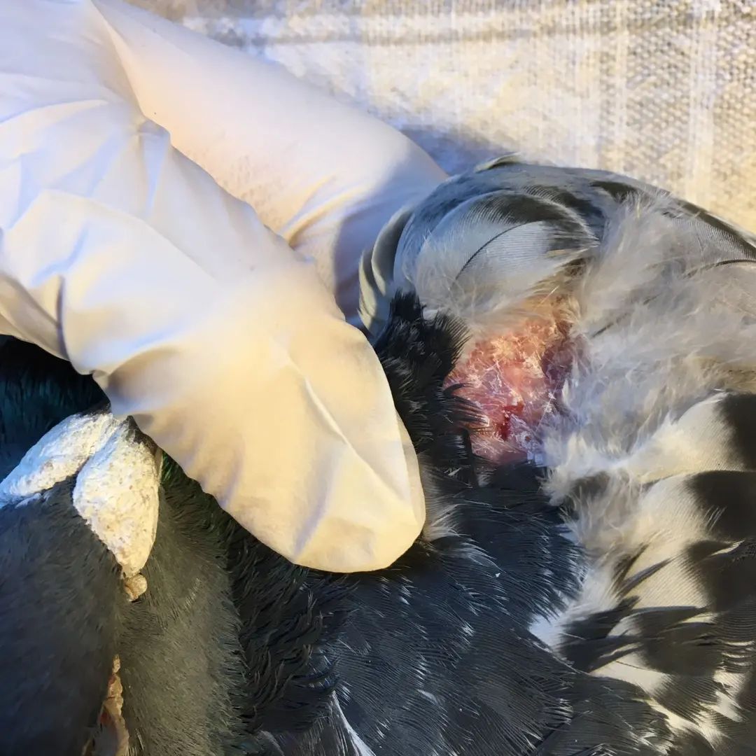 Das Brieftäubchen hat einige Wunden davongetragen als es von Krähen angegriffen wurde. Ein paar kleinere Verletzungen sind dabei und ein offener Bruch am Fuß.