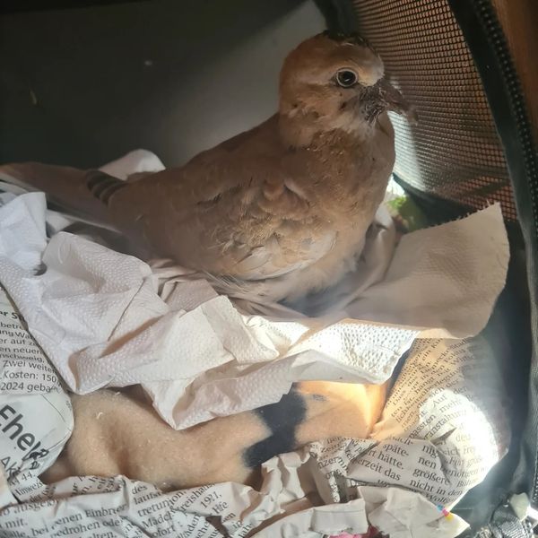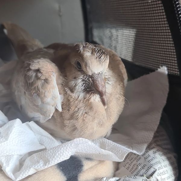 Die kleine Türkentaube ist schutzlos im Garten herum geirrt. Sie ist wohl gegen die Scheibe gedonnert und hatte ein Anflugtrauma, sowie eine Beule. Noch dazu hatte Alva eine Zecke am Kopf.![]()