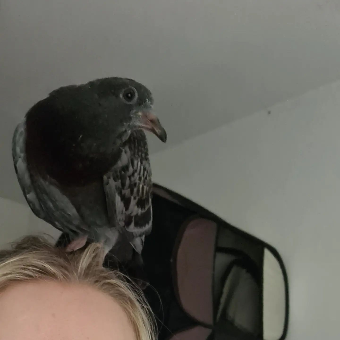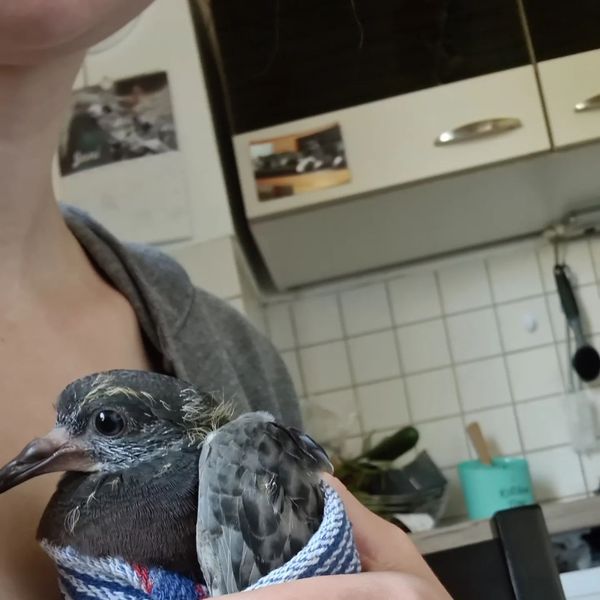 Mittlerweile kann er selbstständig picken, würde aber gerne weiter gefüttert werden. Das Fliegen übt er auch fleißig. Und wenn er dabei mal auf dem Kopf landen muss, ist das eben so. Ein richtiges Goldstück, der Kleine. Bald ist er soweit, dass er in unseren betreuten Schlag kann.