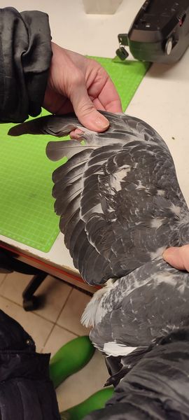 Die Schwungfedern des rechten Flügels fehlen. Sie wäre nicht mehr in der Lage gewesen, sich mit Futter zu versorgen oder eventuellen Gefahren rechtzeitig zu entkommen. In der Pflegestelle kann sie sich nun ausruhen und bleibt solange, bis die Schwungfedern nachgewachsen sind.