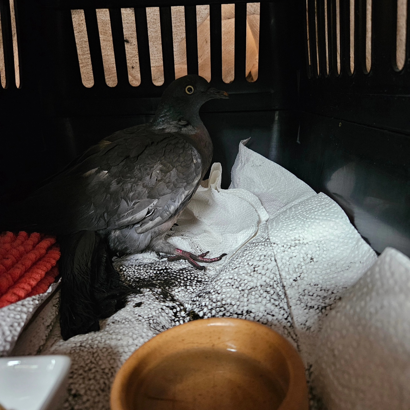 Die Ringeltaube wurde durch Zufall in einem Schornstein geborgen. Wie lange er dort verharrte, ist nicht ganz klar. Ein Schornsteinfeger befreite ihn aus dieser Misere und so konnte er in eine Pflegestelle gebracht werden.