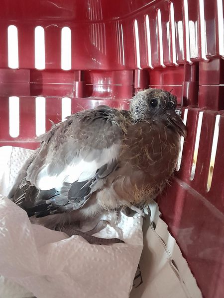 Das kleine Ringeltaubenbaby hat schon viel erleben müssen, obwohl sie noch so jung ist. Erst fällt das arme Küken aus dem Nest, wohl knapp aus 10 Meter Höhe, dann wurde Kasha auch noch von Wespen belagert und zusätzlich am Auge gestochen. Einen kleinen Kratzer hat sie auch auf dem Schnabel. Der Wespenstich wurde gekühlt und behandelt, sie wird gepäppelt und kann sich nun erstmal richtig ausruhen.