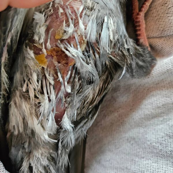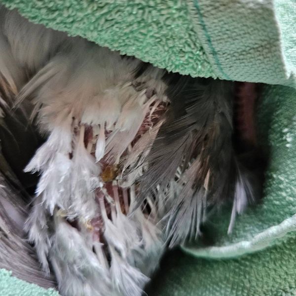 Meera ist noch jünger als Leo und wurde in der Nähe vom Neuen Rathaus aufgelesen. Die Kleine hatte Kotbommel an den Füßen, die sich nur mit einem warmen Bad lösten. Leider war ihr Zeh so angegriffen, dass er abfiel. Zudem ist sie extrem mangelernährt und es fehlen dadurch sehr viele Federn. Der andere Fuß ist etwas geschwollen und das Knochengewebe sehr weich. Sie bekommt Antibiotika, Schmerzmittel, Vitamine und extra Calcium. Wenn sich der Zustand nicht ändert, muss wohl über eine Amputation nachgedacht werden.
